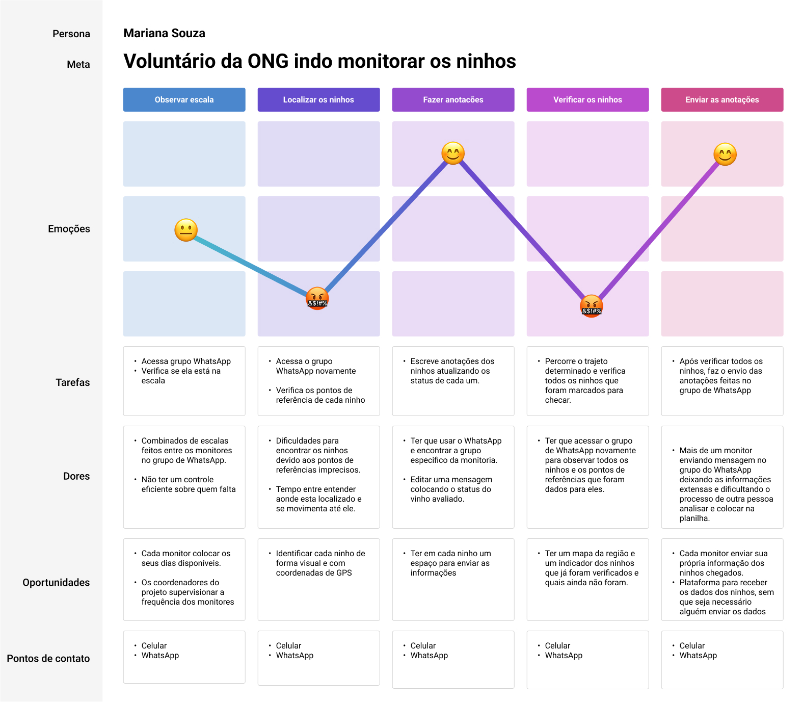 Para garantir que a solução atendesse de fato às necessidades dos voluntários, apliquei a abordagem do Design Thinking, passando por um processo de imersão, mapeamento de desafios e validação de oportunidades. A criação da persona Mariana e a construção da jornada do usuário foram essenciais para entender as dificuldades enfrentadas no monitoramento dos ninhos e identificar pontos de melhoria.