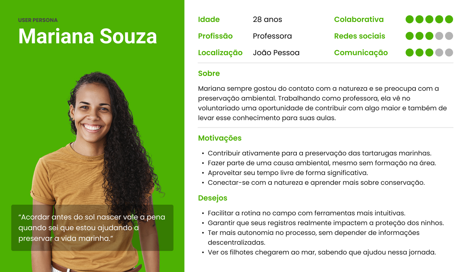 Criar uma persona é essencial para entender as necessidades reais dos usuários e desenvolver uma solução mais eficiente. Por isso, defini a Mariana, uma voluntária que representa os monitores do projeto. Com essa referência, pude criar um fluxo mais intuitivo e funcional, garantindo que o Tarta Metrics atenda às demandas do dia a dia no monitoramento dos ninhos.