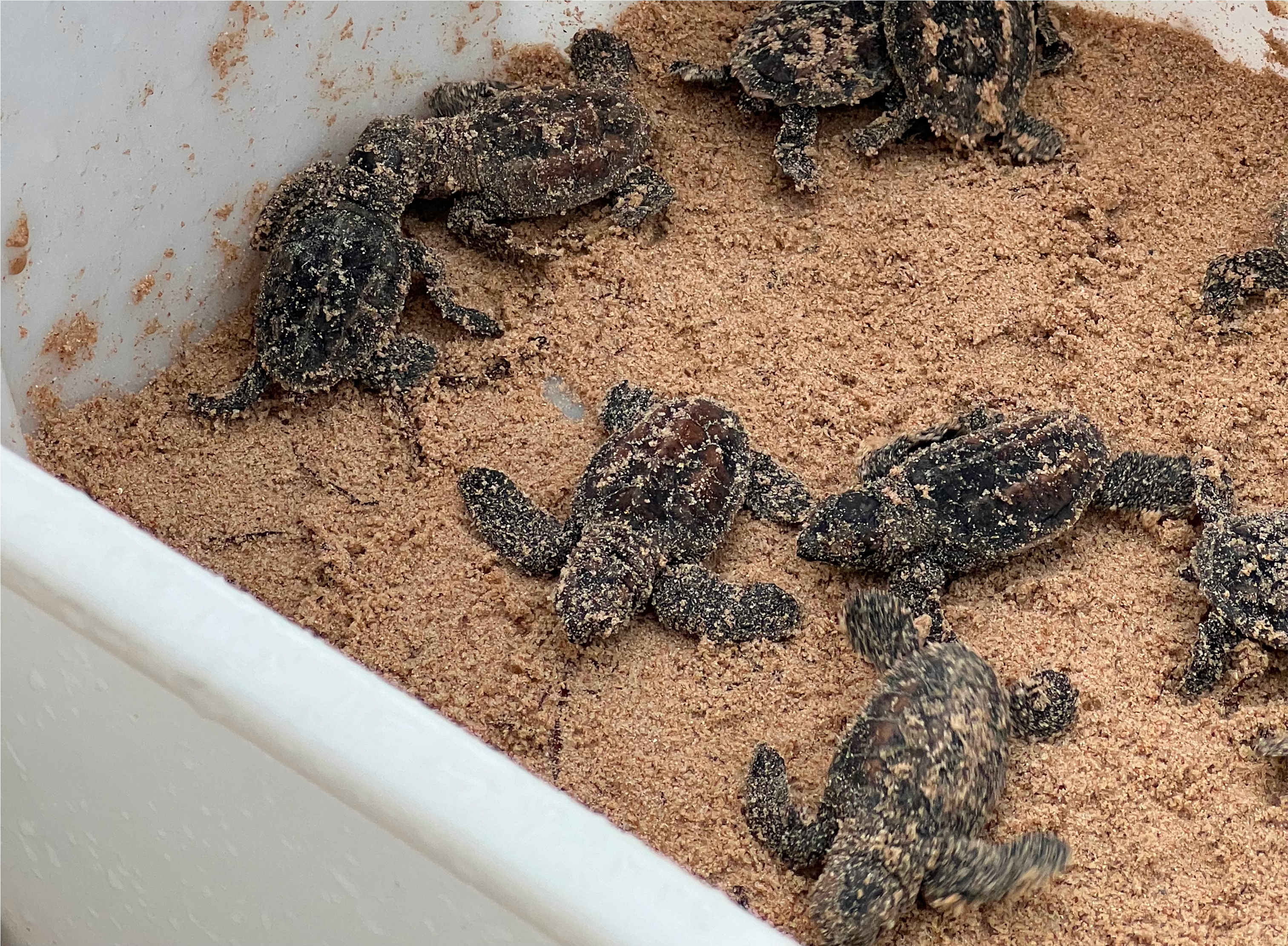 Para proteger os filhotes desse perigo e de predadores naturais, os voluntários cercam os ninhos com telas, garantindo que mais tartarugas cheguem ao mar em segurança.