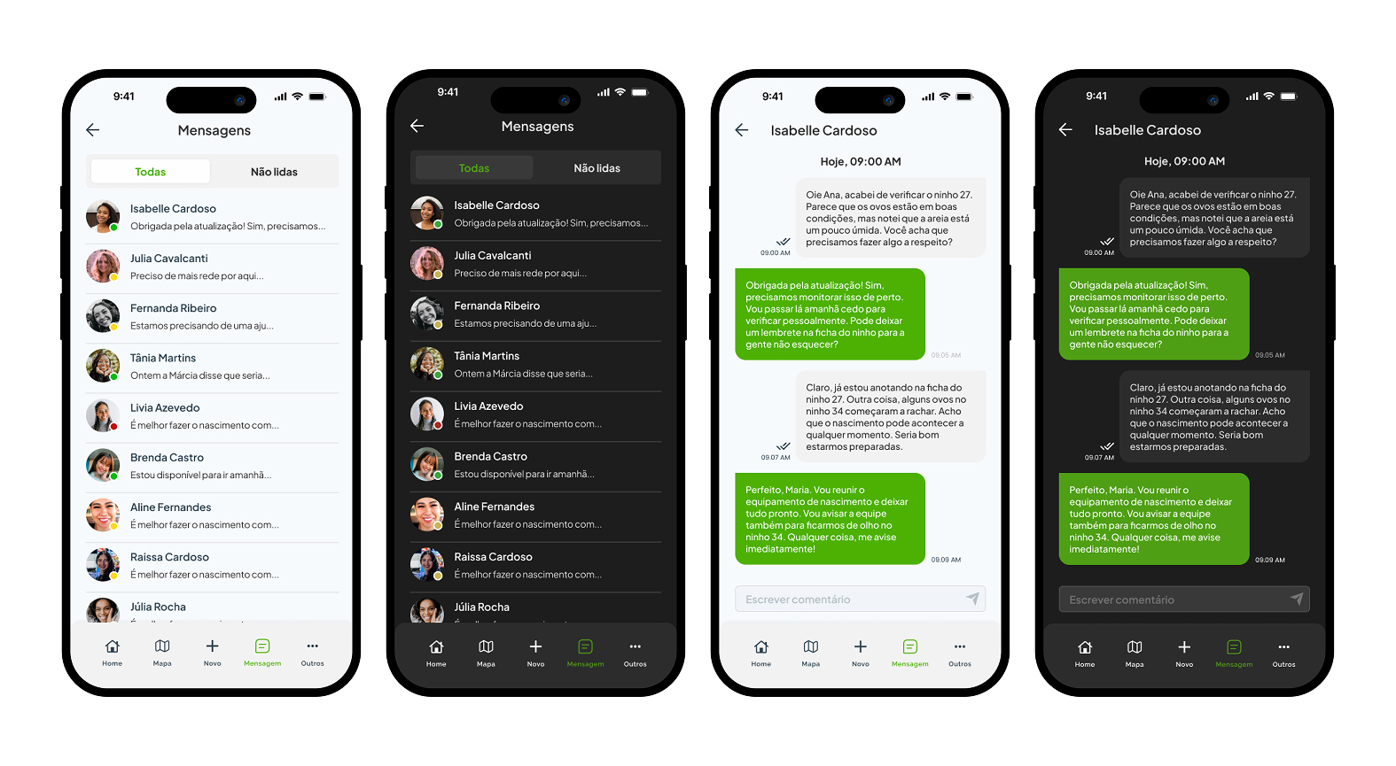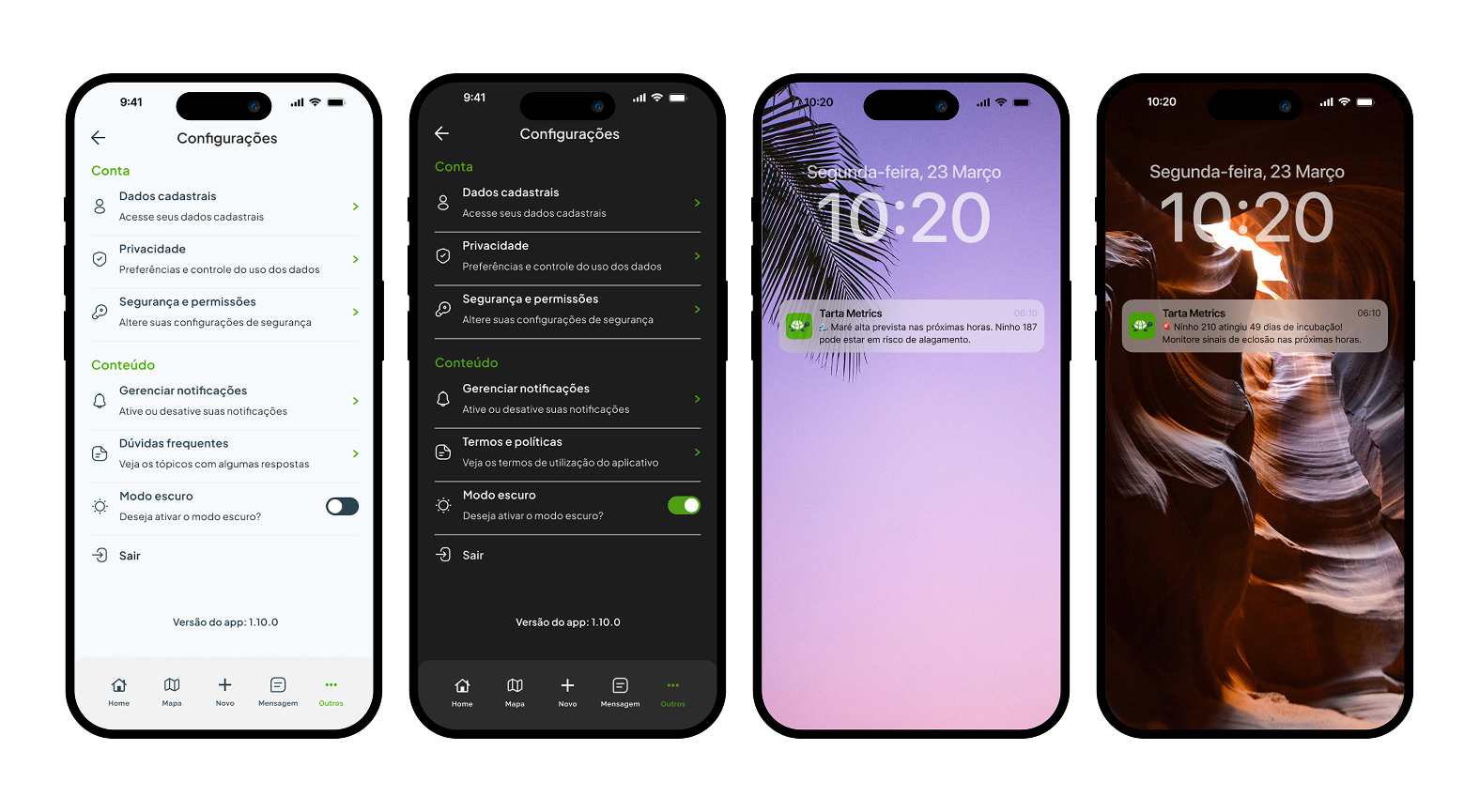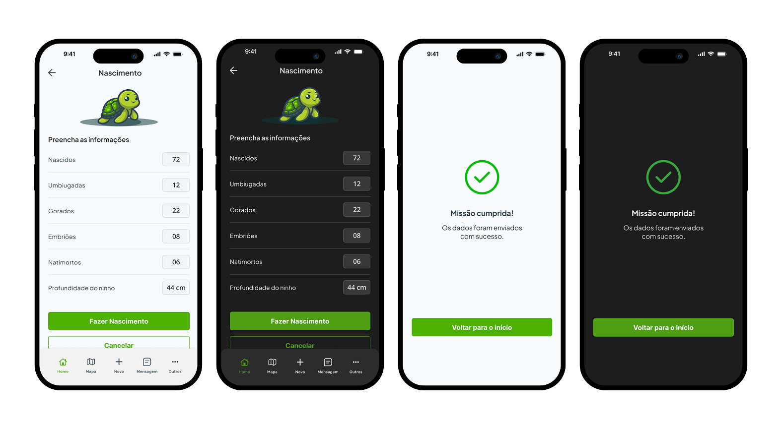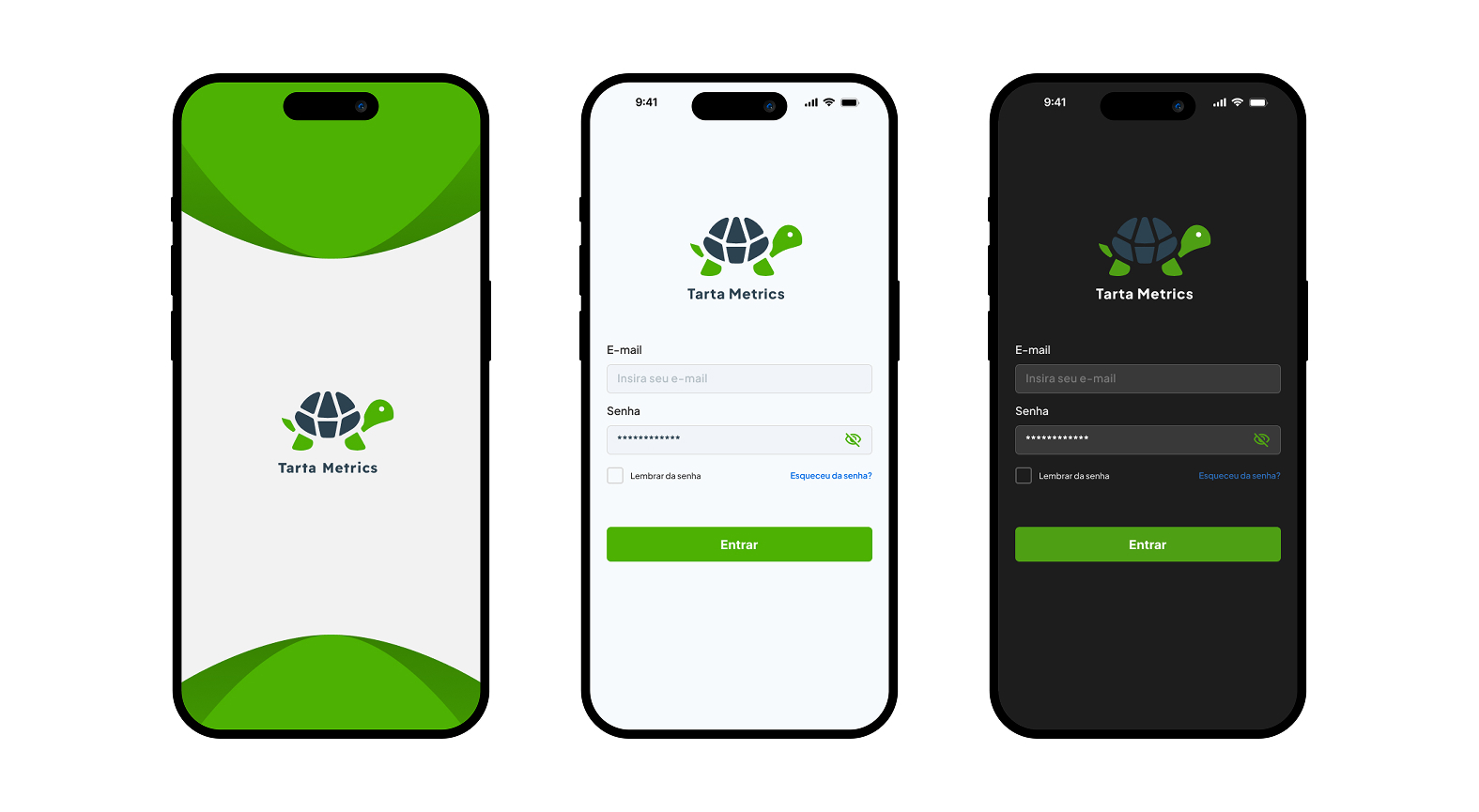 A interface do Tarta Metrics foi pensada para ser fácil de usar e realmente ajudar os voluntários no dia a dia. Cada tela guia o usuário de forma simples, desde o login até o registro e acompanhamento dos ninhos. Também criei o protótipo em modo light e dark, para que cada monitor escolha o que for mais confortável na hora de usar. A seguir, vou mostrar as principais telas e como elas facilitam o monitoramento.