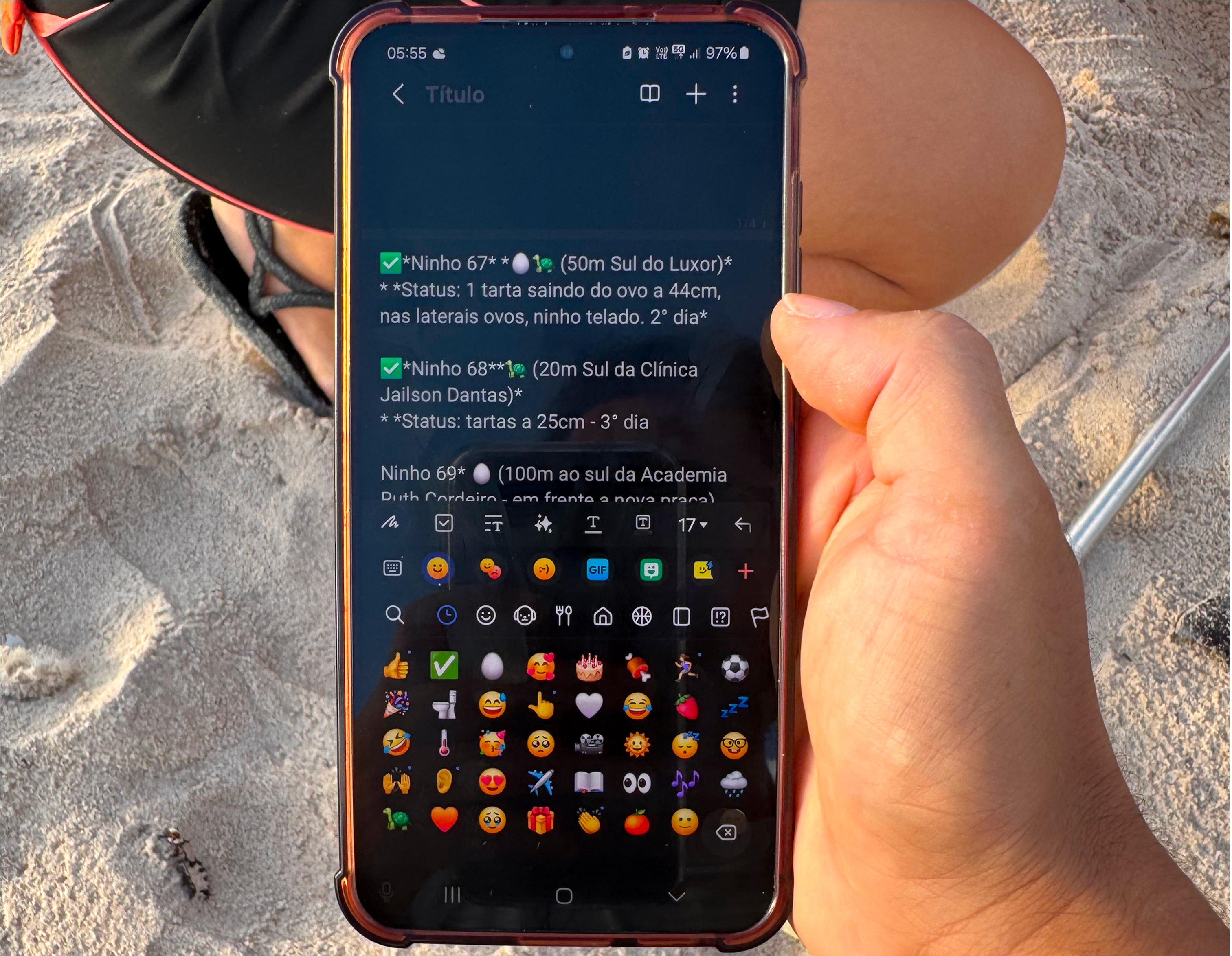 Em uma das minhas viagens pelo Brasil, visitei minha prima em João Pessoa na Paraíba. Durante minha estadia, acompanhei seu trabalho voluntário no monitoramento de ninhos de tartarugas marinhas e observei de perto a rotina dos voluntários. Esse contato me permitiu entender os desafios enfrentados diariamente e identificar oportunidades para quem sabe criar uma solução através do Design.